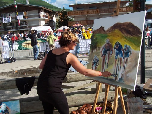 Op 6 en 7 juni '12 was ik als supporter aanwezig bij de Alpe d'HuZes. Omdat ik als kunstenaar regelmatig live-impressies maak tijdens bruiloften, bedrijfsfeesten e.d., heb ik tijdens Alpe d'Huzes ook een aantal schilderijen gemaakt. In 2 dagen tijd schilderde ik voor een bedrag van 1400 euro bij elkaar.