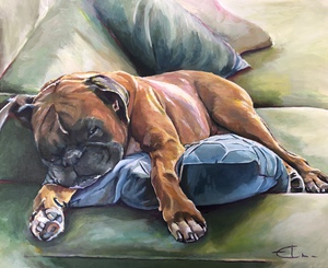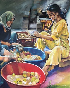Dit schilderij is gemaakt n.a.v. een foto in het kookboek van Karsu. Een groot deel van haar familie waar dit kookboek mee tot stand gekomen is, is bij de aardbeving omgekomen. Ik heb de primaire kleuren geel, rood en blauw de hoofdrol gegeven in dit schilderij en daarbij andere kleuren laten doorwerken en laten ontstaan.