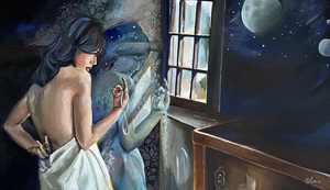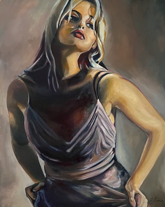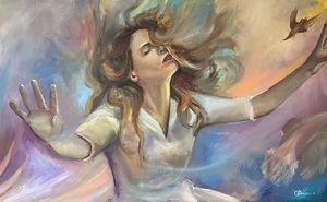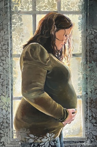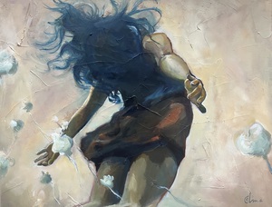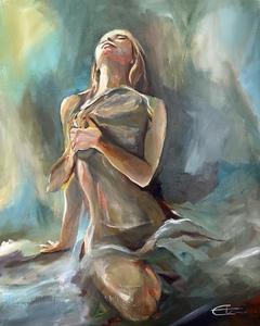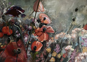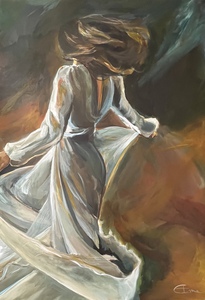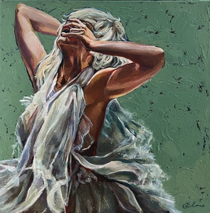 2022Geschilderd op schilderdoek met daar overheen een kanten stof in blank houten lijst